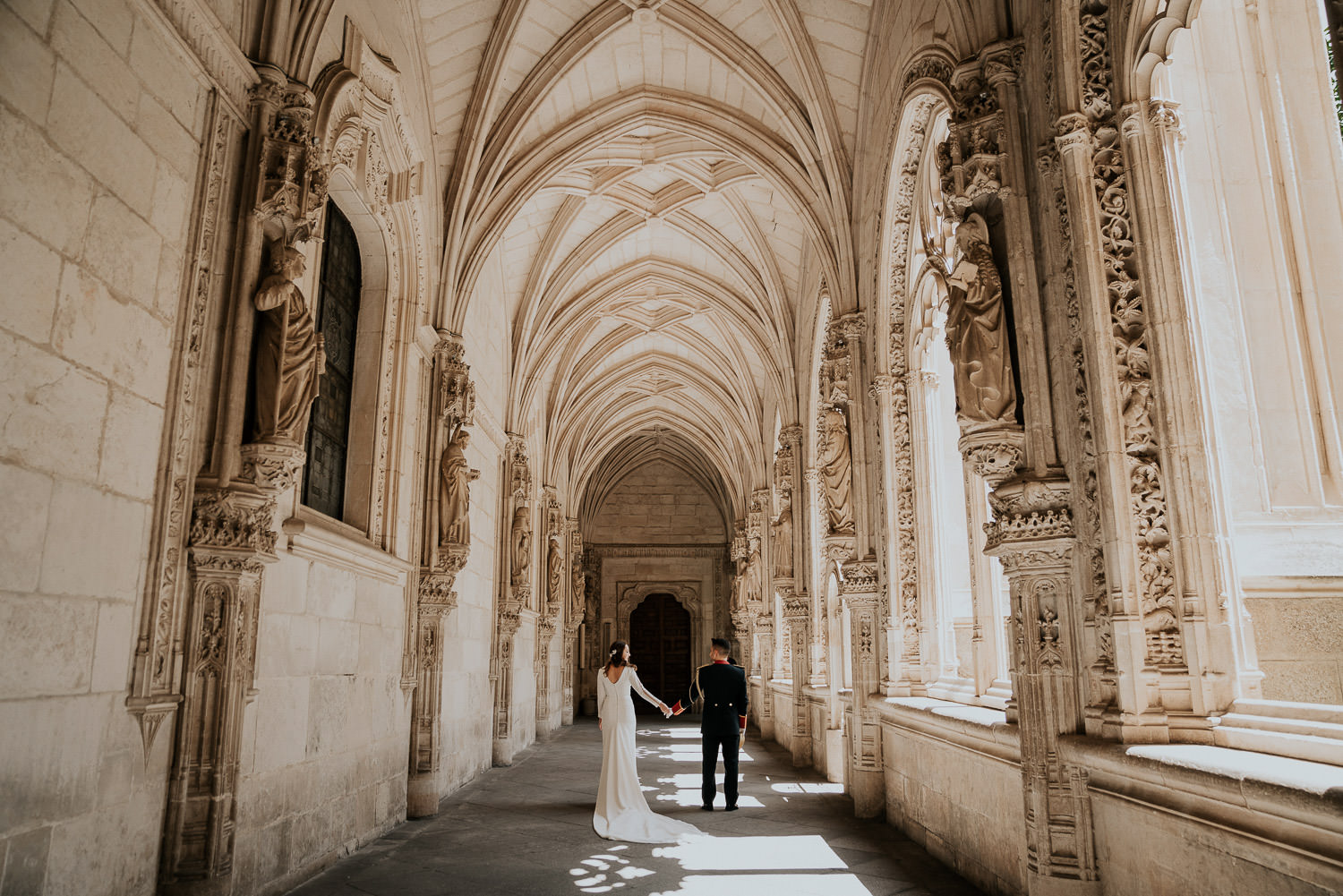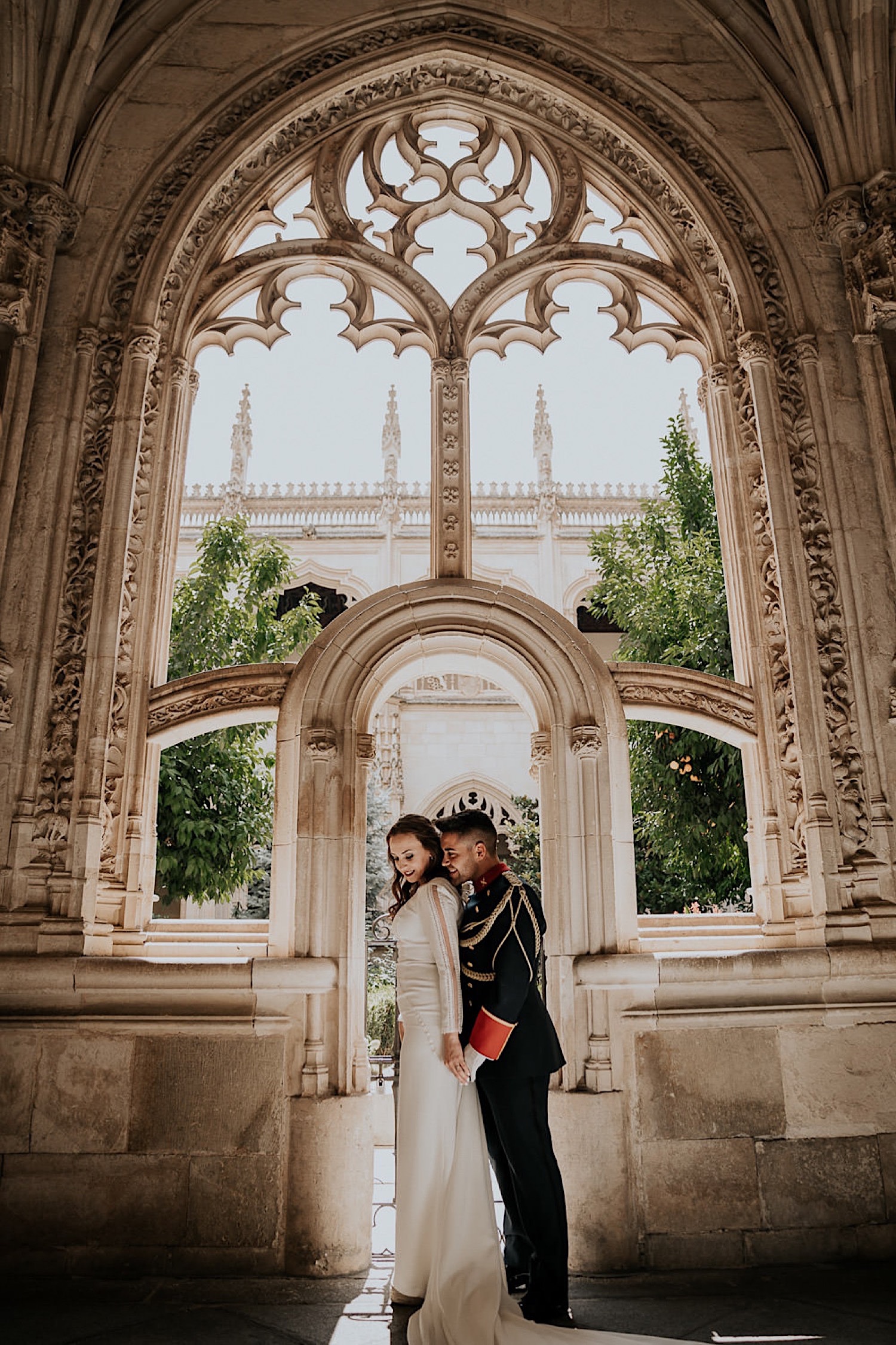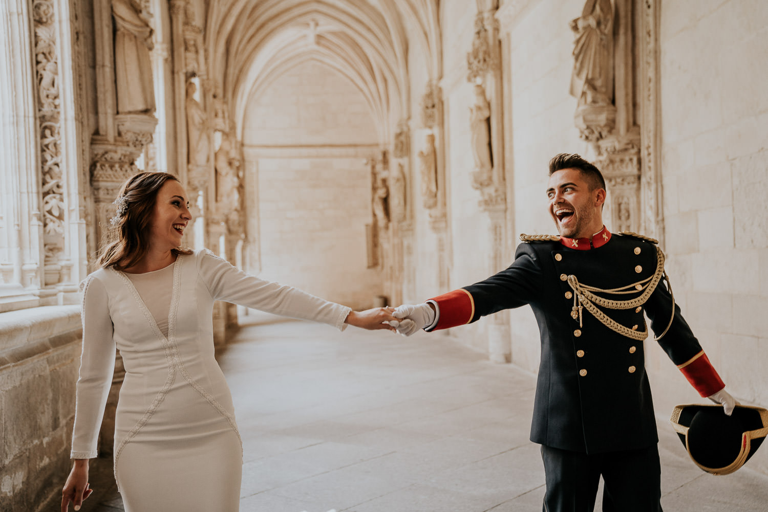 Qué calor hacía cuando llegamos. Pero, al entrar al Monasterio de San Juan de los Reyes todo se esfumó. Qué fresquito y qué tranquilidad, en silencio y nosotros solitos. Aproveché todas las luces y las sombras que me regalaba el lugar y capté todas las improvisaciones de Alfonso y Mónica, un baile por allí, un abrazo por allá, ahora te quito y te pongo el tricornio, risas y más risas…